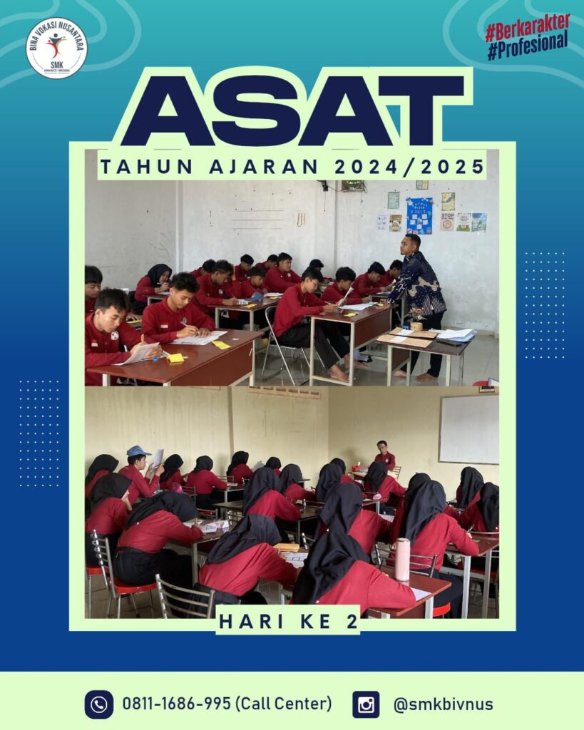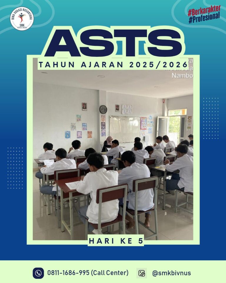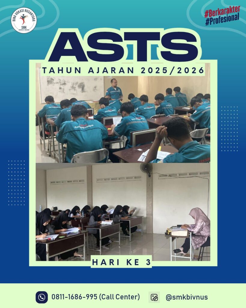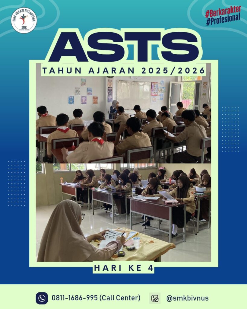 SMK Bina Vokasi Nusantara melaksanakan Asesmen Sumatif Tengah Semester (ASTS) Ganjil Tahun Pelajaran 2025/2026 pada tanggal 15–19 September 2025. Kegiatan ini diikuti oleh seluruh peserta didik dari kelas X, XI, dan XII.